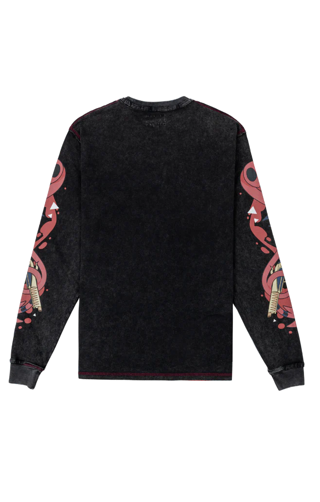 Unleash your inner imp with the Blitzo Long Sleeve Tee, an edgy tribute to the fearless leader of IMP! This tee is designed for fans who want to showcase Blitzo’s wild, chaotic energy in style. Featuring bold, striking graphics on the chest and both sleeves, this long sleeve captures Blitzo’s fierce personality and devil-may-care attitude in every stitch.