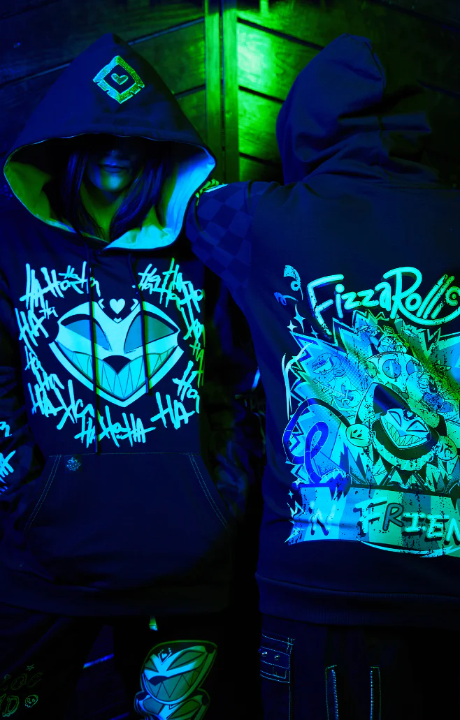 HAHAHAHAHAHA!! Show your love for the ruler of the Loo Loo Land stage, ROBO FIZZ, with this Glow-In-The-Dark Hoodie that'll leave folks in literal and figurative stitches! With a Greed Ring green glowing print, double lined hood, checkered sleeves, a shot of our iconic house band on the back, and embroidery that’ll light up the surprisingly more flammable than we thought audience, this hoodie is a fashionable indulgence that would make Mammon proud!