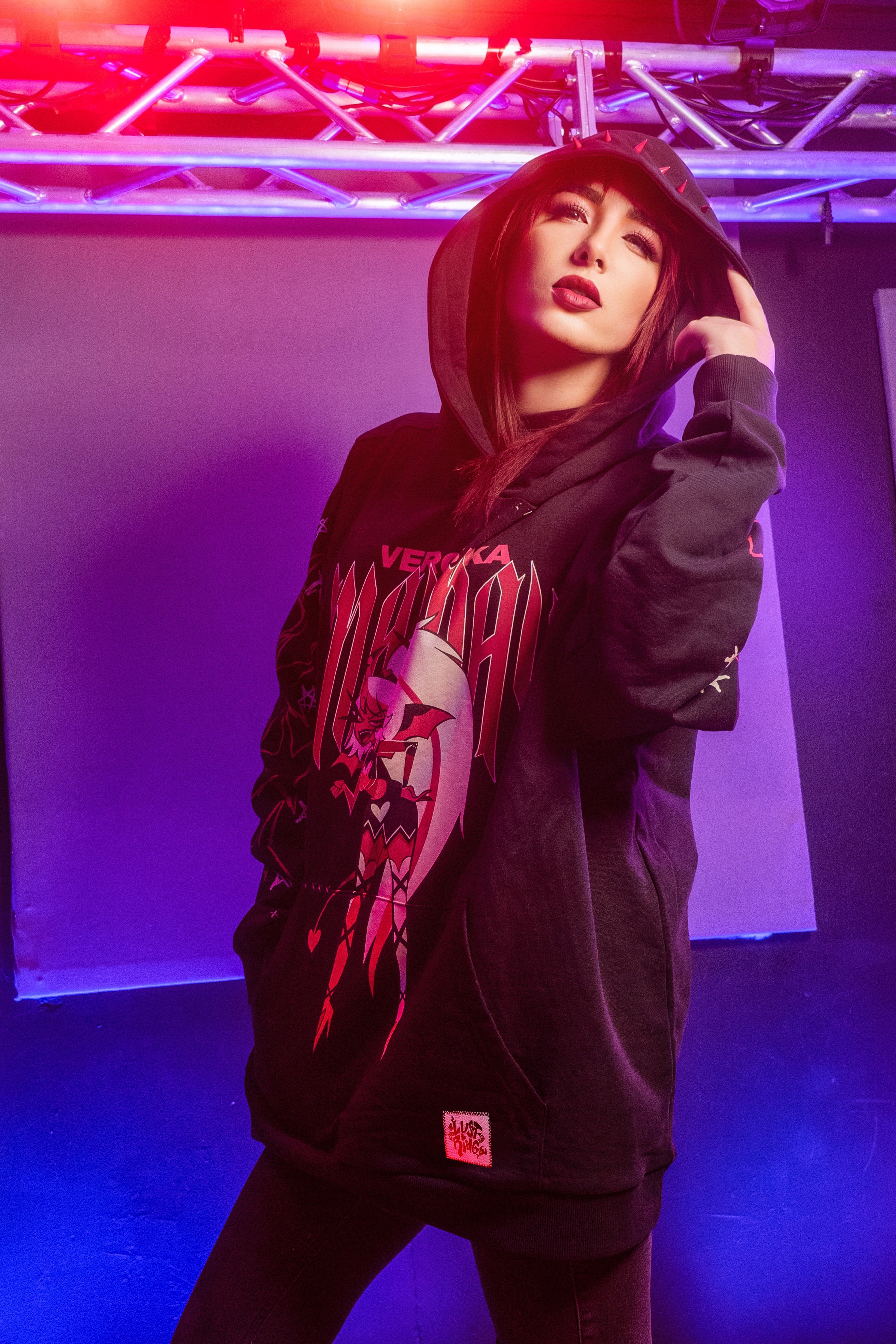 Become a style icon just like Verosika Mayday in our grungy Verositour Hoodie! You'll be summoning sexy succubus energy every time you slip on that pink spiked hood or roll up those star-studded sleeves. Welcome to show biz, kid!